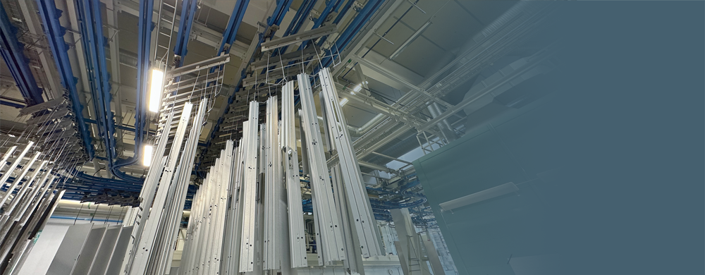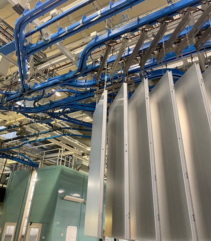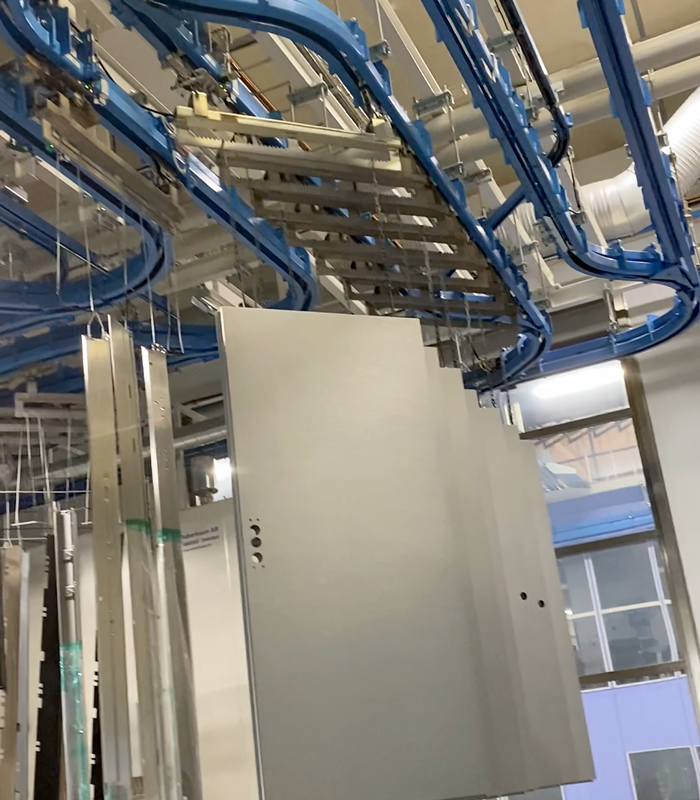 Subject: Surface treatment line with CALDAN overhead conveyor End-user: Daloc AB Installation site location: Sweden Parts to be handled: fire, sound and security doors and frames Dimensions of parts (diameter x h): max. Ø 200 x 3.500 mm Weight of parts: max. 500 kg per wagon Cycle time – total (transport plus process time): 120 seconds per wagon Conveyor speed: – 4 – 6 m/min, adjustable (transport) – 0,6-2,4 m/min, adjustable (pre-treatment) Loading and unloading of parts: manually on conveyor stopped Rotation of parts: motorized at stop Rotation in: – painting booths Surrounding temperature: max. 100°C