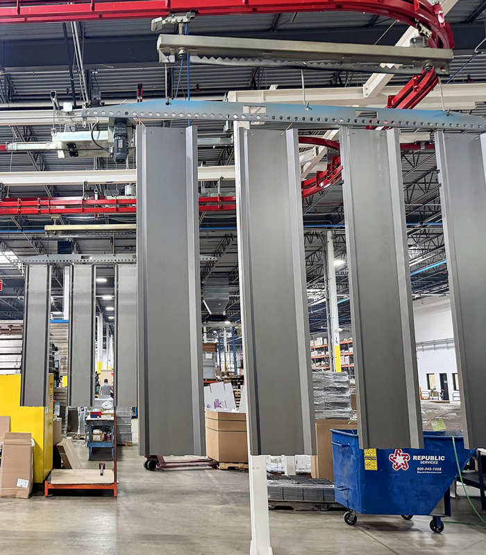 Thema: Oberflächenbehandlungsanlage mit CALDAN Hängeförderer Endkunde: NU-WAY Industries Aufstellungsort: Illinois, USA Art der Teile: Verschiedene Präzisionsmetallprodukte: – Einzelteile und Schweißkonstruktionen – Mechanische Baugruppen – Elektromechanische Baugruppen – Gewerbliche Kochgeräte – Gehäuselösungen für den Außenbereich – Kiosklösungen Abmessungen der Teiel (l x w x h): max. 156” x 48” x 84” (max. 3,962 mm x 1,219 mm x 2,134 mm) Gewicht der Teile: max. 800 lbs (363 kg) pro Laufwagen Taktzeit (transport plus Prozess): 2.48 min pro Laufwagen Durchsatz pro Stunde: 24 Laufwagen Be- und Entladung der Teile: Manuell in Stop-Position Umgebungstemperatur: max. 482°F (max. 250°C)