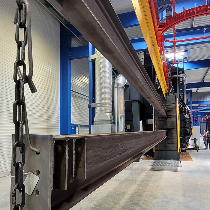 Thema: Oberflächenbehandlungsanlage mit CALDAN Hängeförderer Endkunde: VILQUIN, Fayat-Gruppe Aufstellungsort: Frankreich Art der Teile: x-large Stahlkonstruktion Abmessungen der Teile (L x B x H): max. 18000x1000x2500 Gewicht der Teile: max. 6000 kg, – 90 % ≤ 5000 kg – 10 % > 5000 kg Taktzeit (Transport plus Handling): 30 min. pro Laufwagen Durchsatz: 2-3 Waggons pro Stunde Fördergeschwindigkeit: – 5 m/min, Power & Free, variabel – 1-2 m/min, Prozess, variabel Be- und Entladen der Teile: Über 2 x CALDAN Hub-Senkstationen, geführte Versionen Hub-Senkstation in folgenden Zonen: Be-/Entladen Prozesstemperaturen: max. 220 °C, manueller Bereich