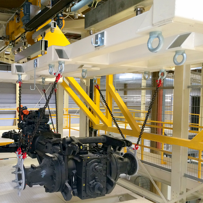 Subject: Surface treatment line with CALDAN overhead conveyor Customer / end user: Kubota France Installation site location: France Type of parts to be handled: Tractor transmissions, axles, gearboxes etc. Dimensions of parts: L = 5.500 / W = 3.000 H = 1.500 mm Weight of parts: Max. 5000 kg Conveyor speed: Max. 5 m/min / Max. 10 m/min (separate chain in spray booth) Surrounding temperatures: 130 °C max