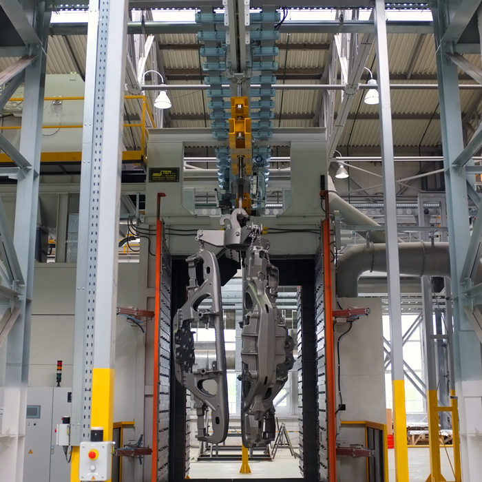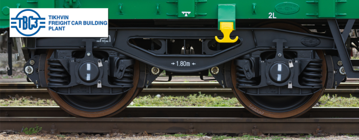Subject: Materials handling with CALDAN overhead conveyor End user: Tikhvin Rail Car Building Plant Country / area of installation: Russia, Leningrad region, Tikhvin, Industrial Site Type of parts to be transported: bogies / railroad trucks Dimensions of parts: 2900 x 2400 x 1300 mm Weight of parts, max: 5.500 kg Cycle time: 10-12 min. Conveyor speed: 4 m/min, adjustable Throughput per hour: 5–6 pieces Loading / unloading of products: manually via lift stations